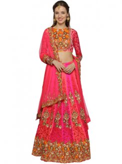 Beige and pink embroidered semi-stitched lehenga choliwith dupatta